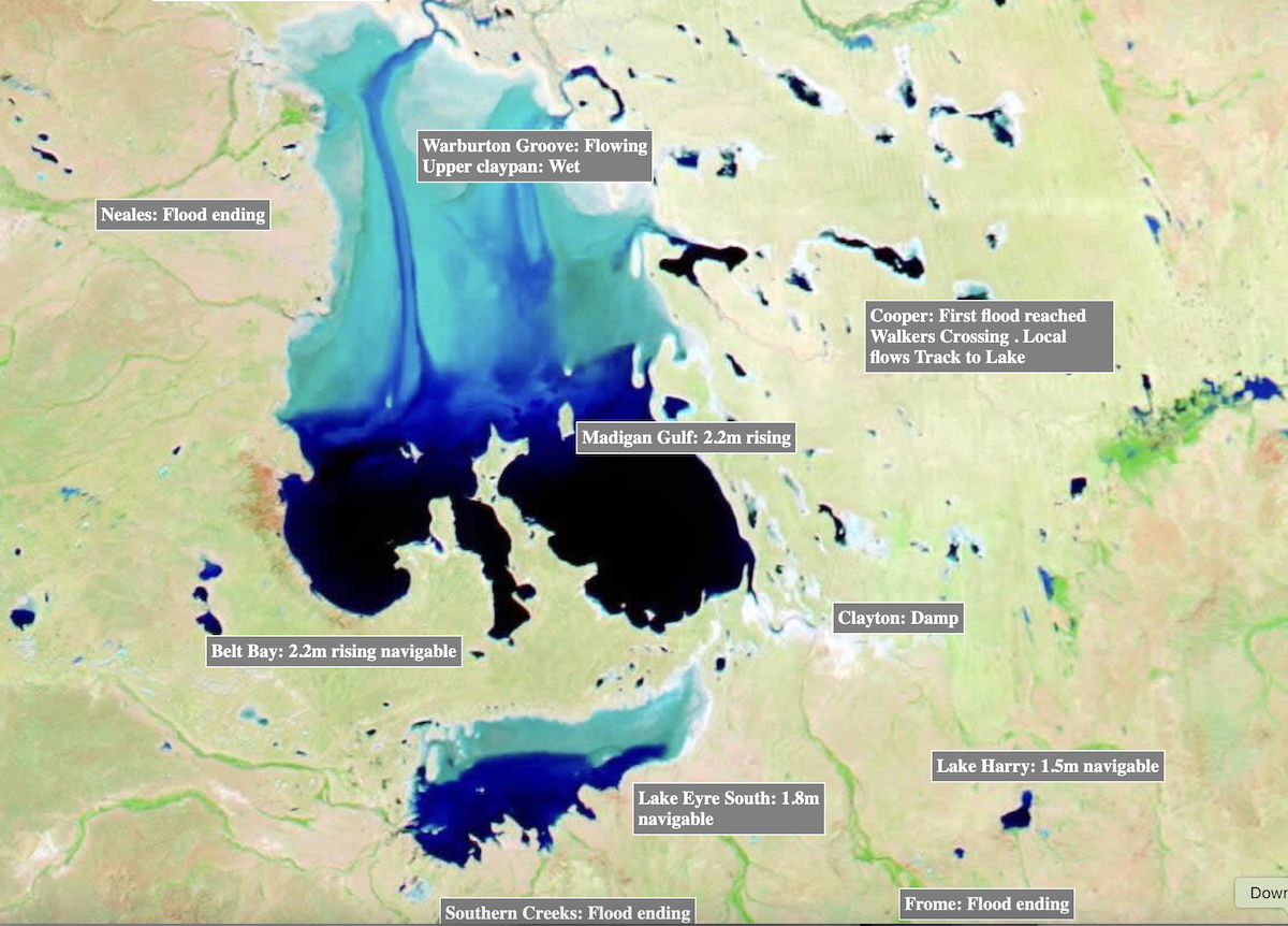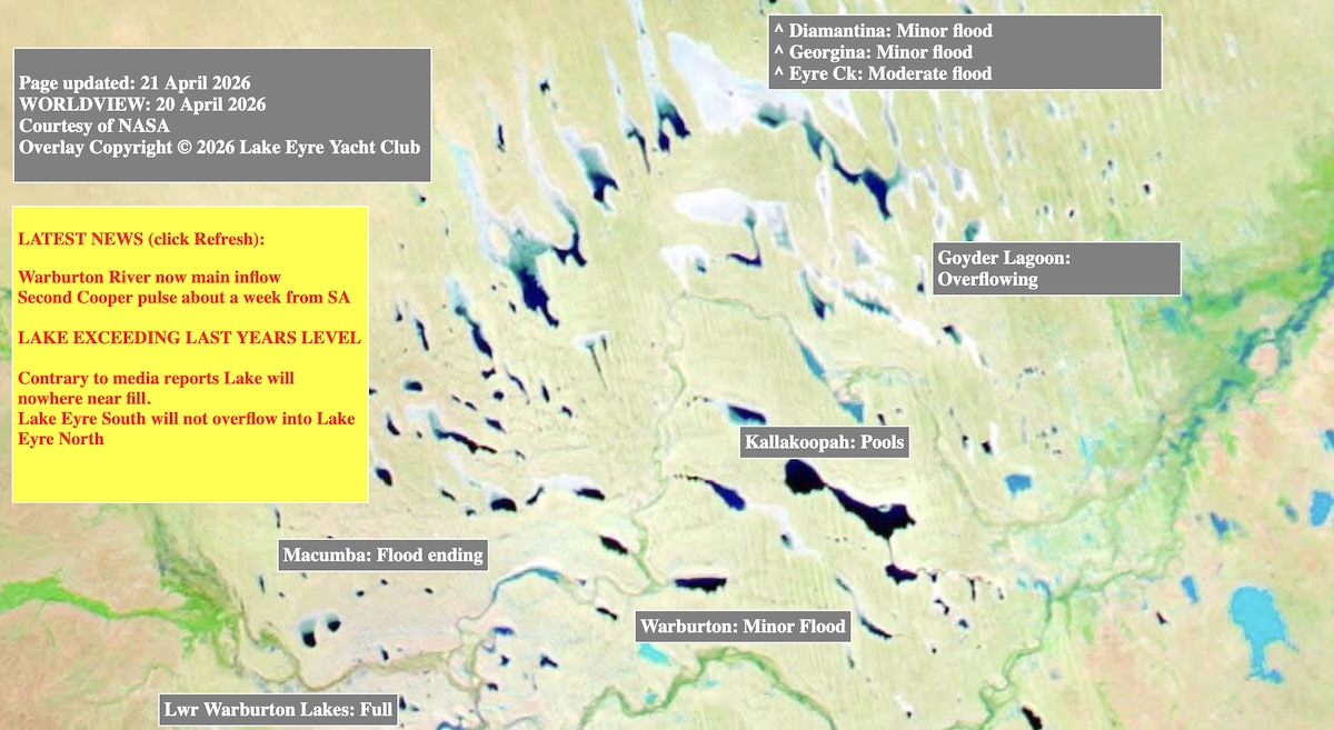 The incredible downpours that were experienced in Outback Queensland earlier this year have been so sustained and significant that water has flowed south at rates not seen since the significant flood of 1974. Per the recent NASA satellite image below from 4 April, 2026, the Lower Warburton Lakes are already full via the Warburton Groove which flows into Lake Eyre, which in turn has resulted in Madigan Gulf and Belt Bay filling to a depth of 2m and rising. Goyder Lagoon is overflowing and the Diamantina and Georgina Rivers are in moderate flood along with Eyre Creek.