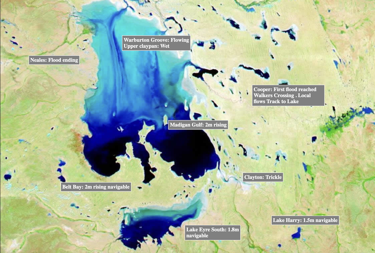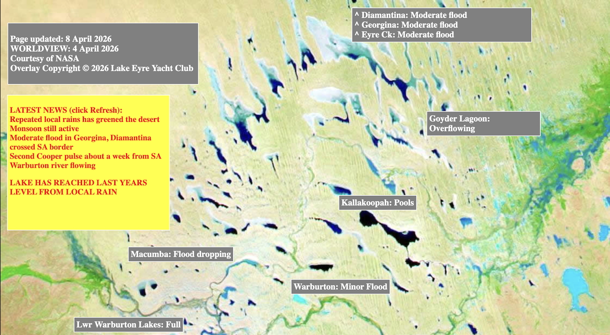 The incredible downpours that were experienced in Outback Queensland earlier this year have been so sustained and significant that water has flowed south at rates not seen since the significant flood of 1974. Per the recent NASA satellite image below from 4 April, 2026, the Lower Warburton Lakes are already full via the Warburton Groove which flows into Lake Eyre, which in turn has resulted in Madigan Gulf and Belt Bay filling to a depth of 2m and rising. Goyder Lagoon is overflowing and the Diamantina and Georgina Rivers are in moderate flood along with Eyre Creek.